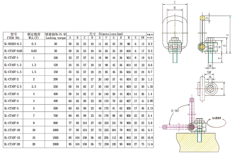 1、吊环与连接板采用高强度优质合金钢模锻而成,经过严格的热处理工艺,螺栓为公制螺纹,达到IS04762标准中12.9级内六角合金角头螺栓。 2、验证载荷为工作载荷极限的2.5倍。 3、抽样